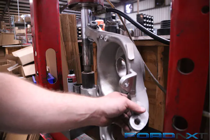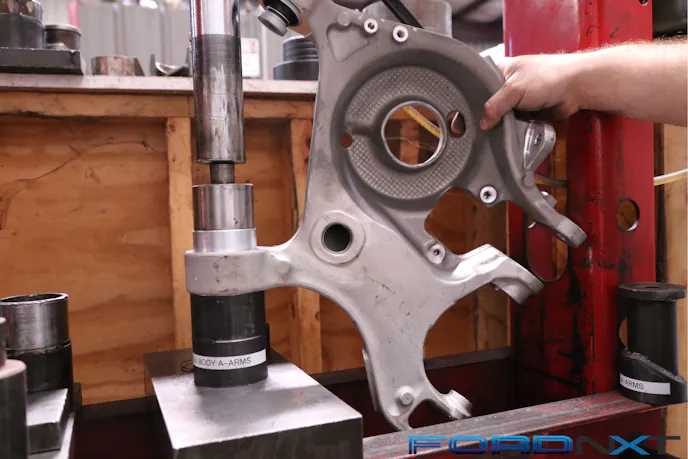 The most challenging part of this upgrade is swapping out the front control arm-to-chassis bushing. The easiest way is to use a hydraulic press to remove and replace the bushing. If you don’t have access to one, you can likely grab a simple one at your local discount parts retailer. As you can see by comparing the removed factory bushing with its spherical BMR replacement, the latter is designed to eliminate deflection to transfer the power more directly to the pavement.