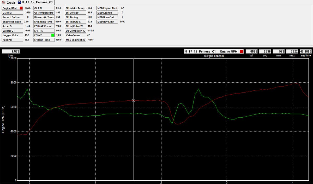 This can of course be determined by the driver or tuner depending on their driving style and their engine/driveline combination. Some might wish to start this when they go on the transbrake, others when the car launches. Because we want to know things like boost and manifold pressure on our supercharged car from the staging process on, beginning our zero point at the launch would skip valuable data.
