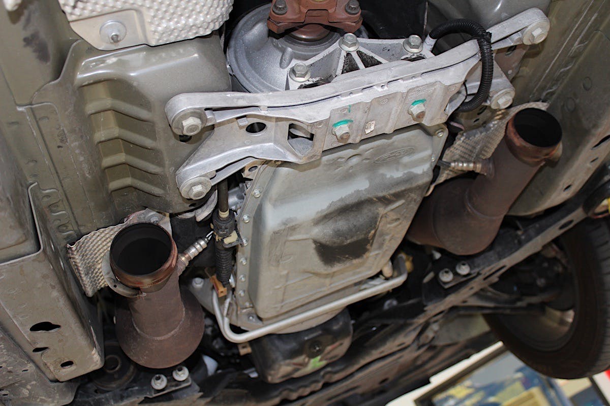 Back on the subject at hand. Removing the current cat-back exhaust entails supporting the factory H-pipe assembly with an exhaust stand, followed by unbolting the two clamps which join the cat-back and the H-pipe together. From there, you can wiggle each side of the cat-back assembly off of its hanger location in the rear of the car, then remove all together.