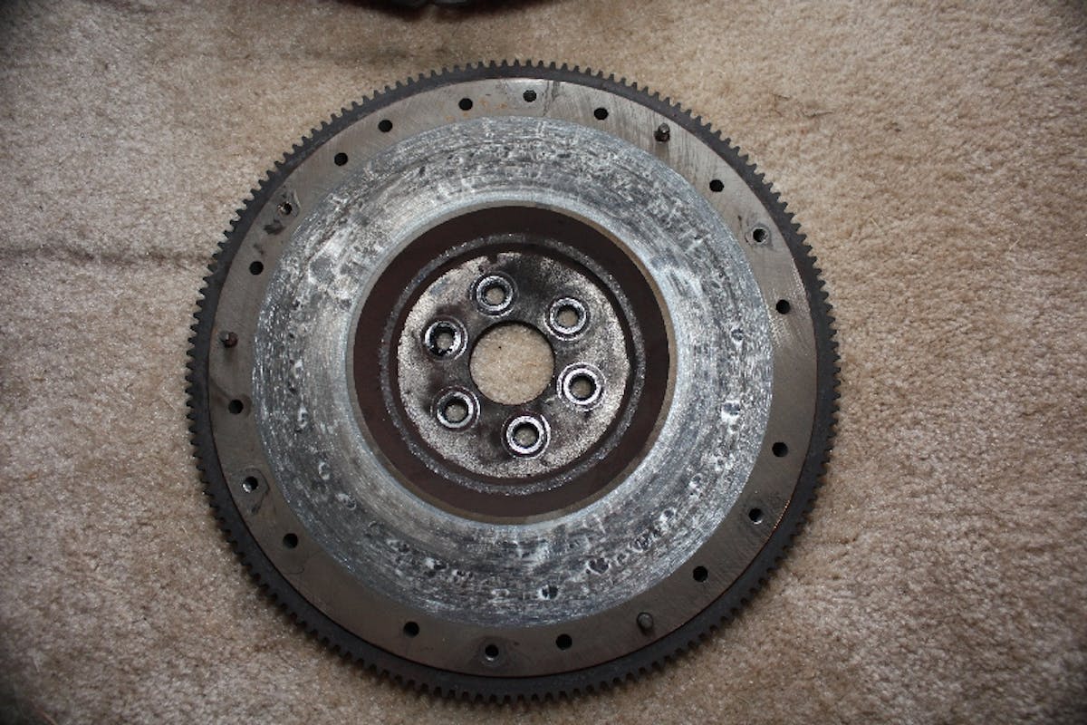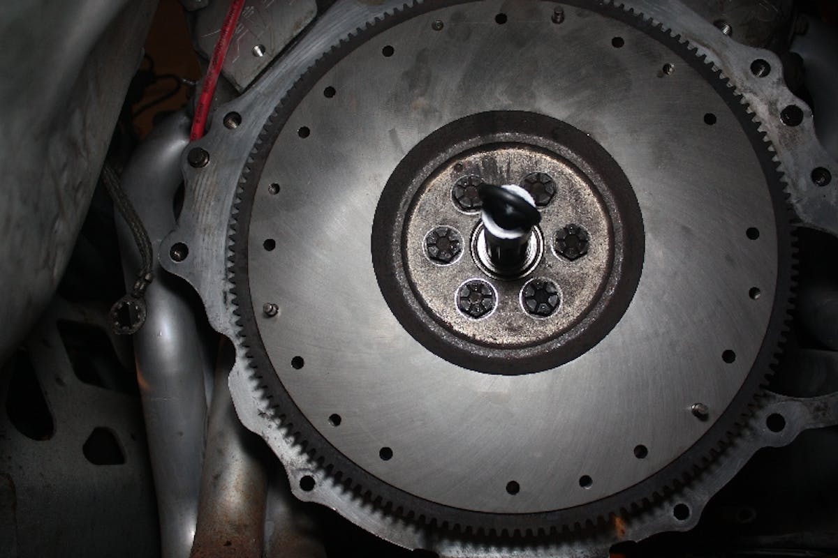 We started by getting the Mustang up in the air and removing the transmission. There are a host of bolts that secure the bell housing to the block, transmission mount, and driveshaft. Now that the pressure plate is visible, insert the clutch alignment tool and remove the bolts that retain the clutch to the flywheel. Using the alignment tool will keep the pressure plate and disc from falling when all the bolts have been removed.