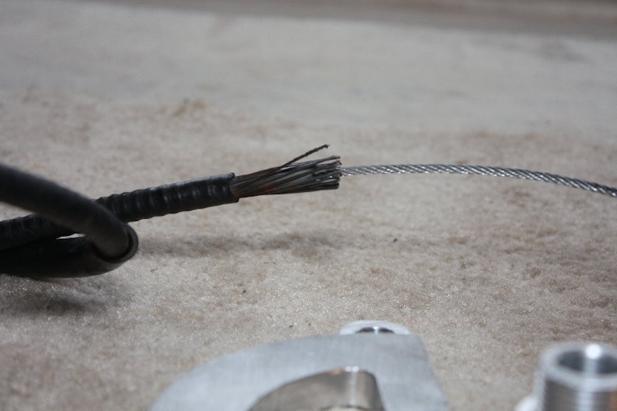 The most detrimental issue is heat from the headers melting the inside of the cable over time. This will cause the pedal to feel stiff or even stop moving all together. Most of the aftermarket cables are not wound as tight as the stock Ford cable and therefore they fail and fray sooner then expected. This car had a cable melted and it was replaced with an aftermarket adjustable cable. As you can see in the photos it is already starting to come apart.