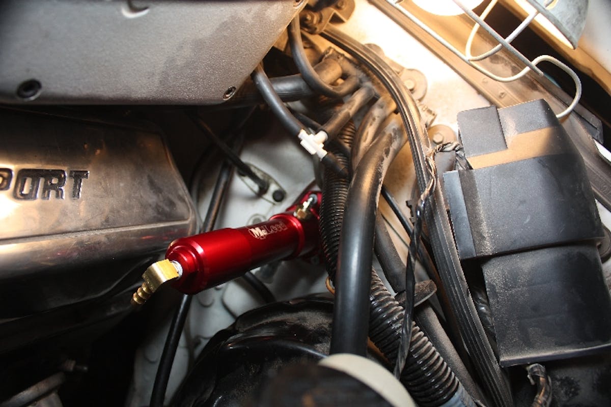 Next is mounting the reservoir to the shock tower on the driver’s side. There is a small cut out at the back for added clearance for the brake master cylinder. There are two mounting screws that will need holes drilled in the shock tower to be mounted. Once the reservoir is mounted the red rubber feed hose can be installed. The braided line can be attached and it will hang down along the firewall until the throw out bearing is installed.