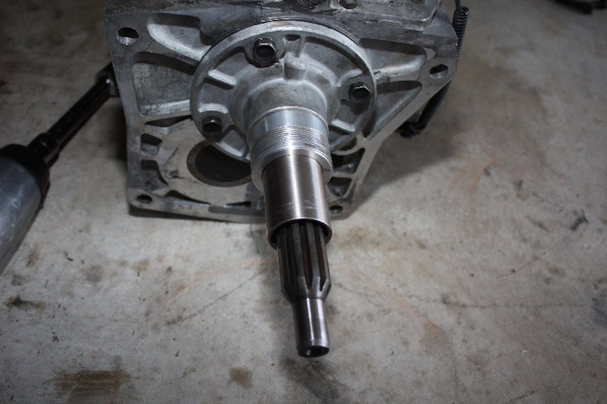 With the transmission out and the bearing retainer clean and smooth slide the spacer sleeve all the way to the rear against the transmission with the beveled side towards the transmission. For this installation we used a new steel bearing retainer from Latemodel Restoration Supply along with new fasteners.