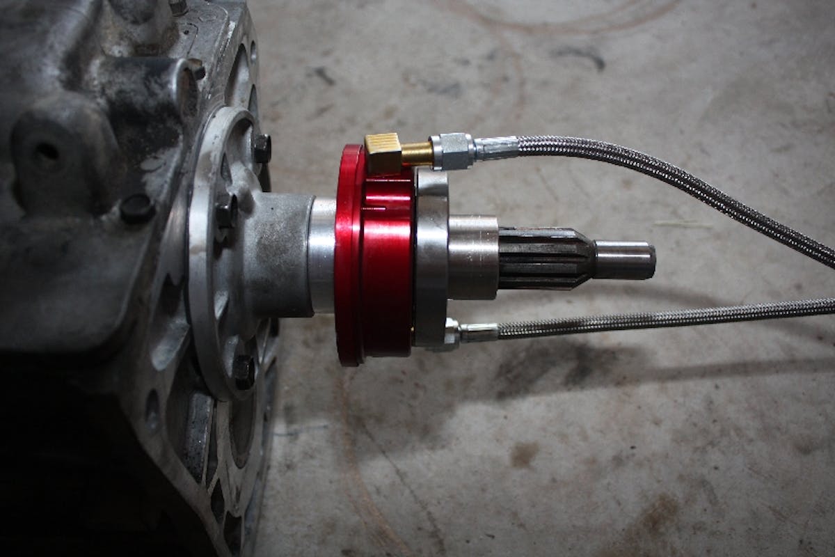 Tie some string around the braided lines coming off the throw out bearing and feed it through the hole in the bell housing where the clutch fork use to reside. This will help you feed the lines through as you install the transmission. Now you can start sliding the transmission back into the bell housing and pulling the lines out the side access hole. Once the transmission is in, connect the lines and bleed the system. I had the best luck with bench bleeding the master cylinder. If there is any slack in the clutch pedal, adjust the firewall adjuster out to get the engagement where you prefer.