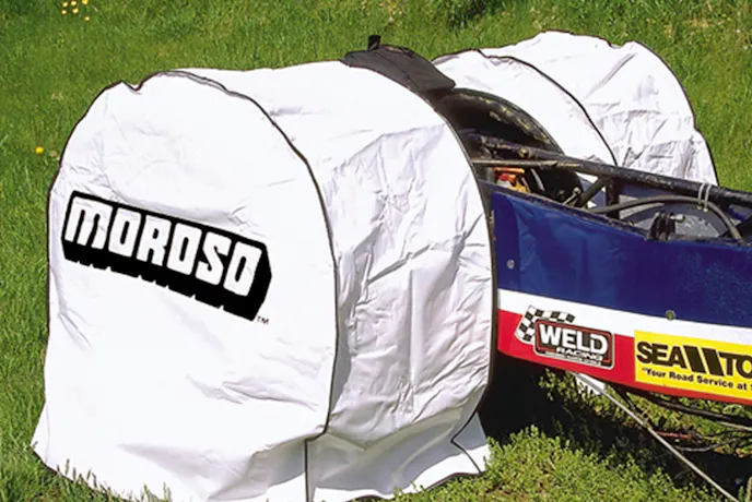 Moroso was one of the innovators of a heavy-duty tire cover that reflects sunlight. Made from reflective 6-mil vinyl combined with an insulator backing, these covers maintain the stability of your tire pressures and prevent rubber degradation. Consider if one rear drag slick in the sun raises as little as 1/2-psi in pressure compared to the other. Differences in pressure and rolling diameter can cause havoc in starting line launches and consistency.