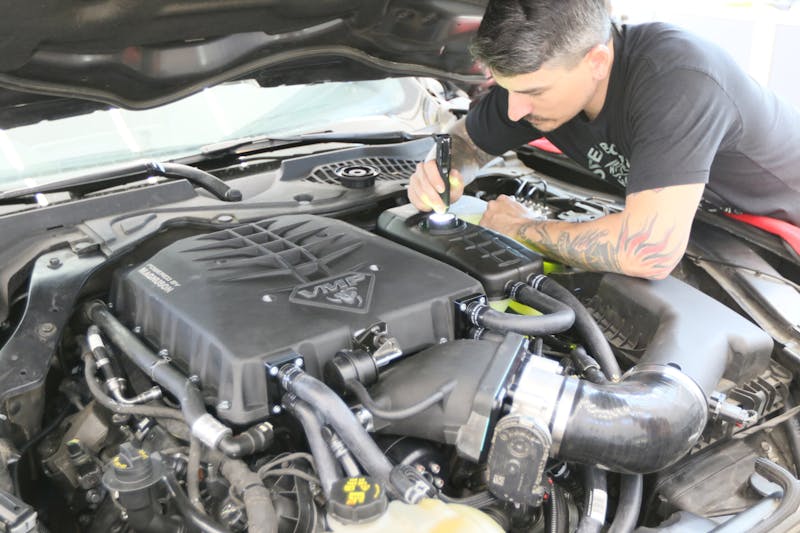 With our UPS driver painfully earning his wages, our front door quickly became inundated with VMP Performance labeled boxes. The quick shipping times meant we were eager to get to work! Installing a supercharger kit is no small task though. However, following VMP Performance’s installation video allowed us to install their Loki Level 1 Supercharger Kit over the weekend. This included installing the supercharger, pulley, heat exchanger, cold air intake, throttle body, fuel rail, injectors and fuel pump booster.