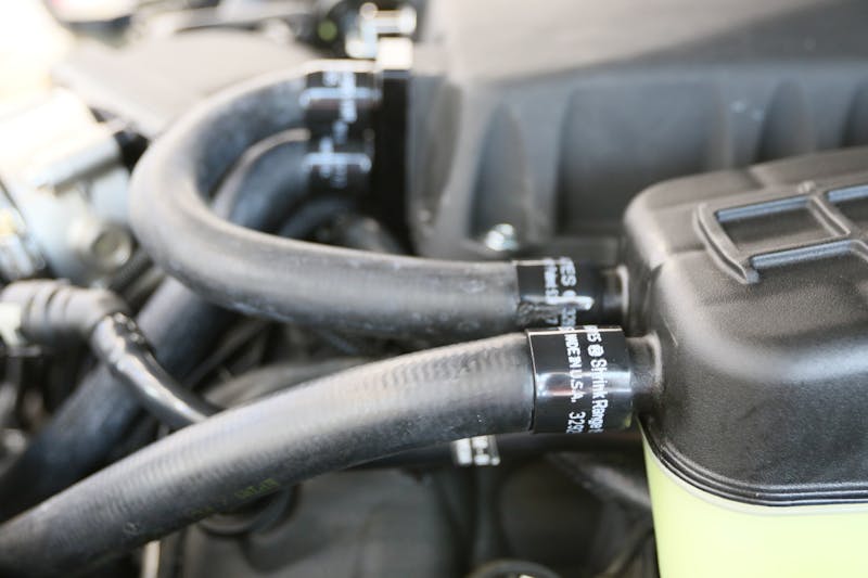 Returning to the engine bay, we proceeded to attach the supercharger inlet to the OEM throttle body adapter. This move preserves CARB legality and allowed us to maintain the stock airbox. With this component securely in place, the final steps entailed installing the air filter and using the included Gates heat shrink to ensure the durability and stability of the hoses connecting to the intercooler.