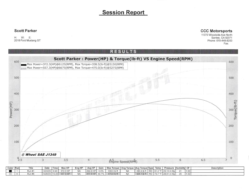 Despite contending with a lower octane rating, the outcomes were still impressive, yielding 557.3 horsepower at only 6,675 rpm (accompanied by 475 lb-ft of torque) on CCC Motorsports’ dyno. To provide a point of reference, when we initially ran the Mustang on the dyno in stock form, it made 372.3 horsepower and 338.5 lb-ft of torque. The incorporation of our supercharger kit had translated to a remarkable 49.7-percent increase in power, even in the face of a 12-degree Fahrenheit temperature increase. However, that was not exactly a clean dyno pull. It ended prematurely because we believed that we had a bad tank of gas (even bad for 91 octane). We’ll cover our subsequent dyno testing in the next story, but the true potential for power lies in a transition to E85 fuel, coupled with the requisite fuel pump adjustments, or at least an elevation in octane rating comparable to the rest of the United States.