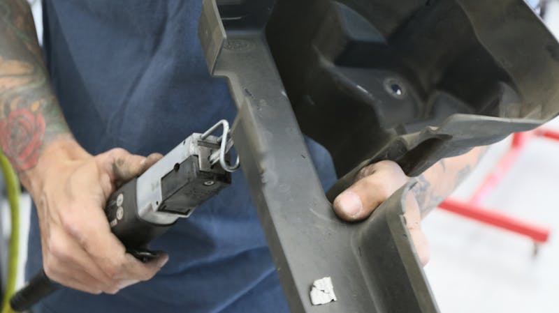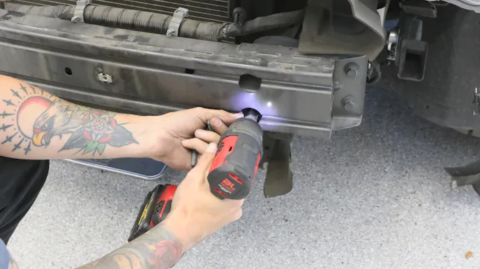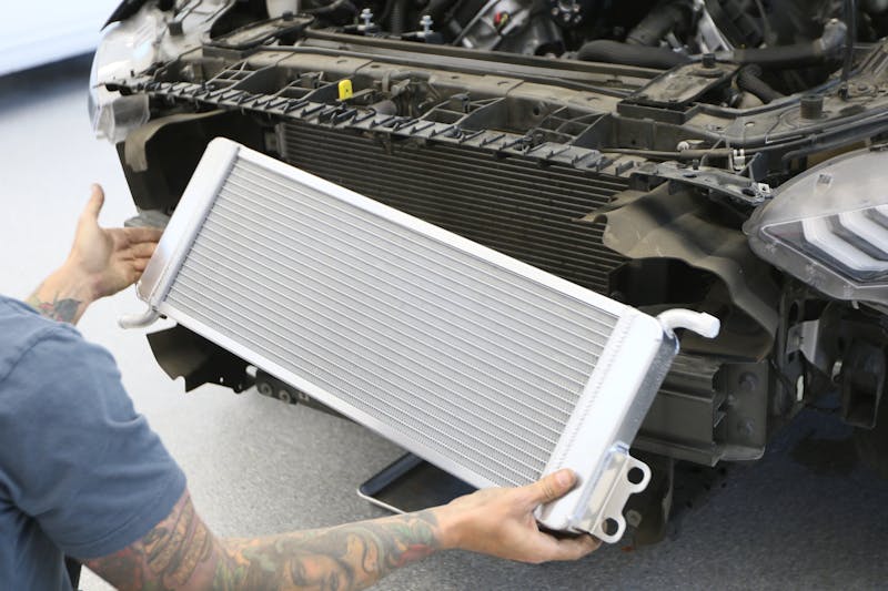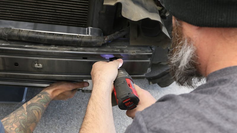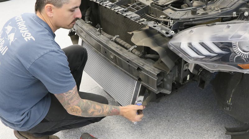 Next up was installing our heat exchanger onto the front of the vehicle. However, in the context of modern cars, particularly the Mustang, this step wasn’t a straightforward one, as we had to dismantle a significant portion of the front end. We dislodged the front bumper via the push pins and clips situated on the bottom and sides. This was followed by the unbolting of screws positioned on the top of the bumper. With the bumper cover removed, our attention shifted towards the active grille component secured with clips and linkage, interconnecting the lower and upper fins. Now that we had accessed this new dimension of the car, we were able to trim the plastic shield to fit the heat exchanger.