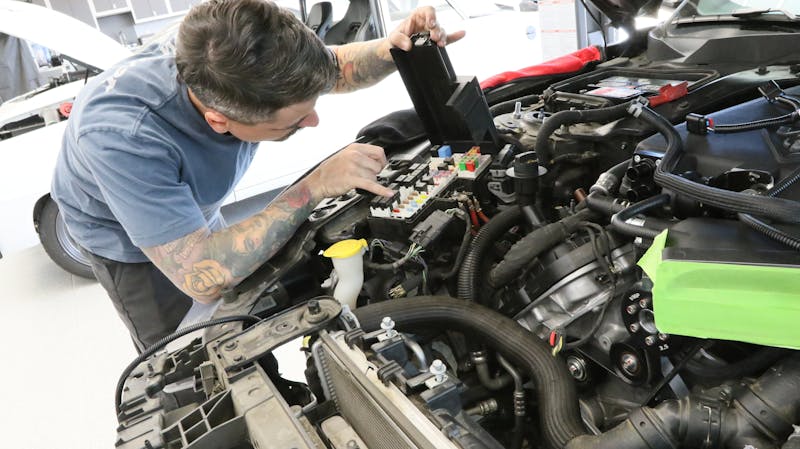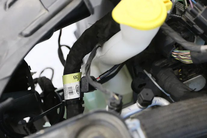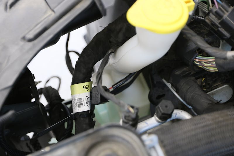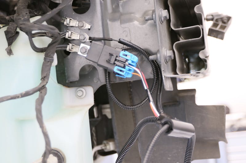 Back at the workbench, we proceeded to insert the bushings into the four eyelets on the VMP heat exchanger. These four eyelets secure the heat exchanger to the chassis via the four crash bar bolts. From there we routed the wiring of the heat exchanger pump to the side of the bumper support bracket, a pathway that ultimately led us up through the engine bay and into the fuse box. We grabbed power from the terminal and zip-tied our fuse neatly to the factory harness.