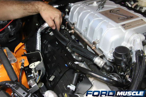 We started off with a smaller sized upper pulley and tensioner before increasing fuel. We knew our fuel pumps would love the additional voltage to maintain strong fuel pressure and flow, so we added a voltage booster. Floating down the fuel stream we found the factory 62-lb injectors insufficient for our new corn-based friend. While some GT500 models came with a factory oil/water separator, ours didn’t. No worries, we were already deep enough to install one. We finished this round off with a large JLT intake. After that it was time to throw some new plugs in and see what numbers our GT500 could conjure up.