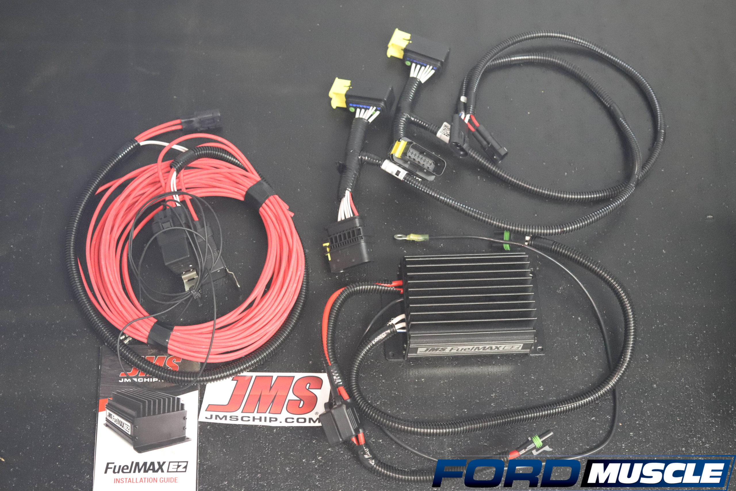 Although the GT500 came equipped with dual fuel pumps in the tank, we knew we would be pushing the limits on E85. To avoid replacing pumps, hanger, and wiring, we opted for the tried and true method: a voltage booster. Factory ECU monitoring has come a long way and fuel pump voltage boosters have followed suit. The latest voltage booster to hit the market was the JMS Chip FuelMAX EZ.