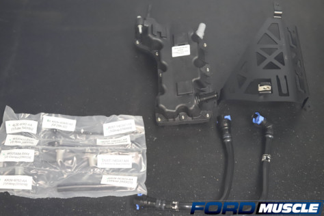 While owners of the GT500 carbon-fiber track package or handling package enjoy the spoils of a factory installed Ford Performance oil separator, the rest of us mere mortals have to purchase it separately. Thankfully, Ford Performance offers the same part number as a complete kit – this ensures fitment will be on point and not an afterthought filled with complex DIY engineering.