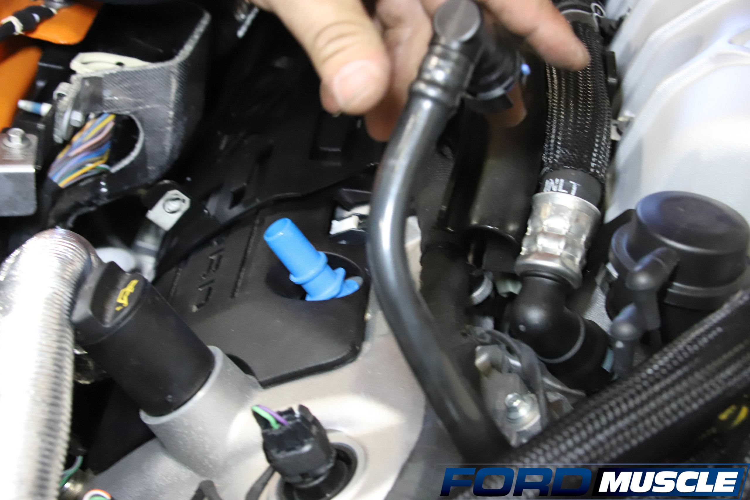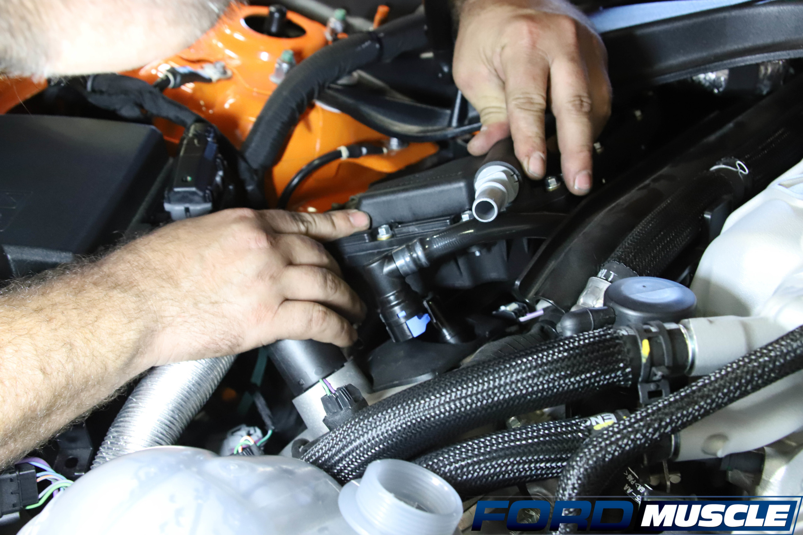 The purpose of the Ford Performance oil separator is to prevent oil vapor from entering the intake system or inevitably finding a new home in our intercooler. Even though this is considered a performance modification, all GT500 owners could see the benefits of an oil separator installed. Since we were pushing past the factory power levels we thought it was time to address this. Aside from being a quality kit that serves its purpose, it also includes a drain back to the valve cover, which makes it essentially maintenance-free and removes the messy oil tank draining process.
