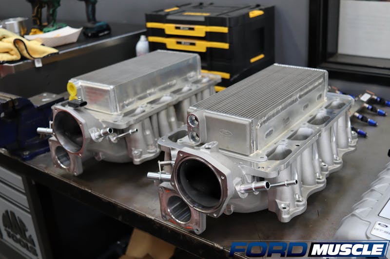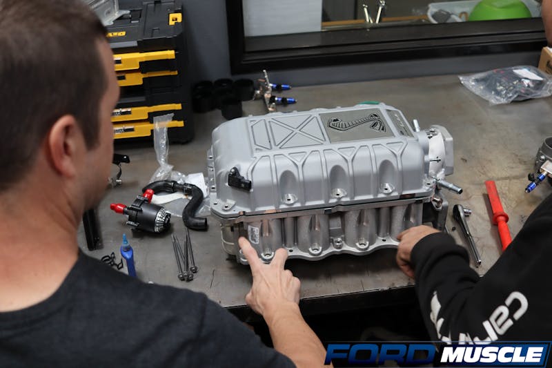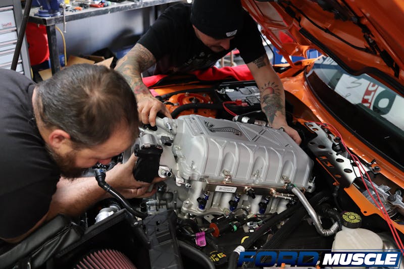 Once we got the chassis configured properly with the use of BMR Suspension, Mickey Thompson tires, and a killer set of Forgeline wheels, we were able to step up to the plate with a host of bolt-on goodies. We added new Fuel injector Clinic injectors, JMS Chip FuelMAX EZ Fuel Pump Voltage Booster, JLT intake, Ford Performance Oil Separator, and everyone’s favorite supercharger modification: a smaller pulley from GripTec. After much success with such few modifications, we went back to our drawing board and crossed off the “Make Power” bullet point before proceeding to one of the final bullet points: “Make More Power.”
