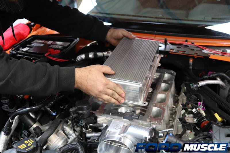 As we increased power from all directions, heat was becoming the bane of our existence. We cooled down intake air temperatures through the use of the JLT intake, but as the air was shoved down the superchargers throat the manifold air temperature was becoming increasingly warmer. Our stock intercooler had no chance of keeping up and resulted in a heat soaked intercooler. The stock unit lacked the cooling capacity needed for our build, which led us to our new Whipple super high density intercooler