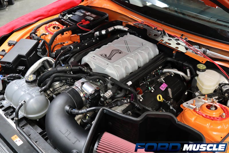 Once we got the chassis configured properly with the use of BMR Suspension, Mickey Thompson tires, and a killer set of Forgeline wheels, we were able to step up to the plate with a host of bolt-on goodies. We added new Fuel injector Clinic injectors, JMS Chip FuelMAX EZ Fuel Pump Voltage Booster, JLT intake, Ford Performance Oil Separator, and everyone’s favorite supercharger modification: a smaller pulley from GripTec. After much success with such few modifications, we went back to our drawing board and crossed off the “Make Power” bullet point before proceeding to one of the final bullet points: “Make More Power.”