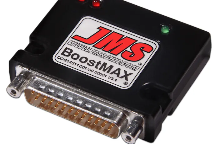 JMS Chip & Performance offers two devices that plug in easily to enhance performance, the PedalMax and BoostMax. The two can be plugged in series to work together. The PedalMax intercepts the throttle by wire signal and enhances it to hasten throttle response and reduce turbo lag. Meanwhile, the BoostMax alters the signals from the manifold absolute pressure and throttle inlet pressure sensors and instructs the powertrain control module to add boost proportional to throttle input. The factory oxygen sensor can add up to 30 percent more fuel to compensate for the extra boost.