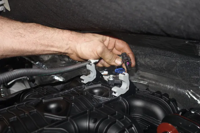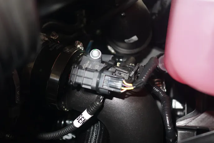 Rick then assembles the BoostMax and harness before plugging the harness in series with the MAP sensor atop the manifold and the TIP sensor on the inlet tube in front of the throttle body. They then routed the harnesses and secured them with zip ties.
