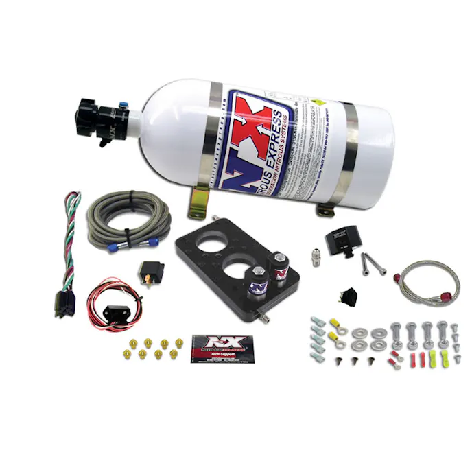 This plate kit, part number 20947-10 features a billet nitrous plate, with the solenoids integrated into it. Not only does this system utilize the Gemini Twin spray barless technology, it also uses a TPS learn procedure, eliminating the need for a mechanically activated switch. This offers faster response time for nitrous to start flowing, and even more reliable operation. There is no fussing with the correct position of a mechanical switch, and no guessing as to whether it’s moved causing the system to activate too early or not at all.
