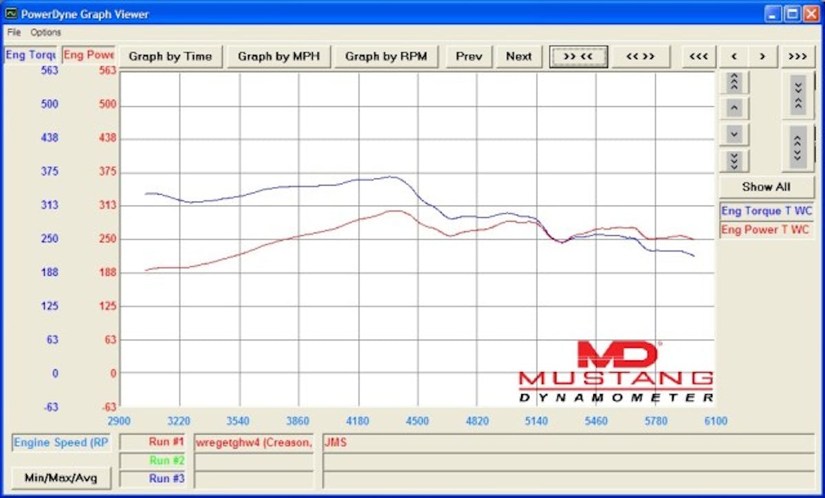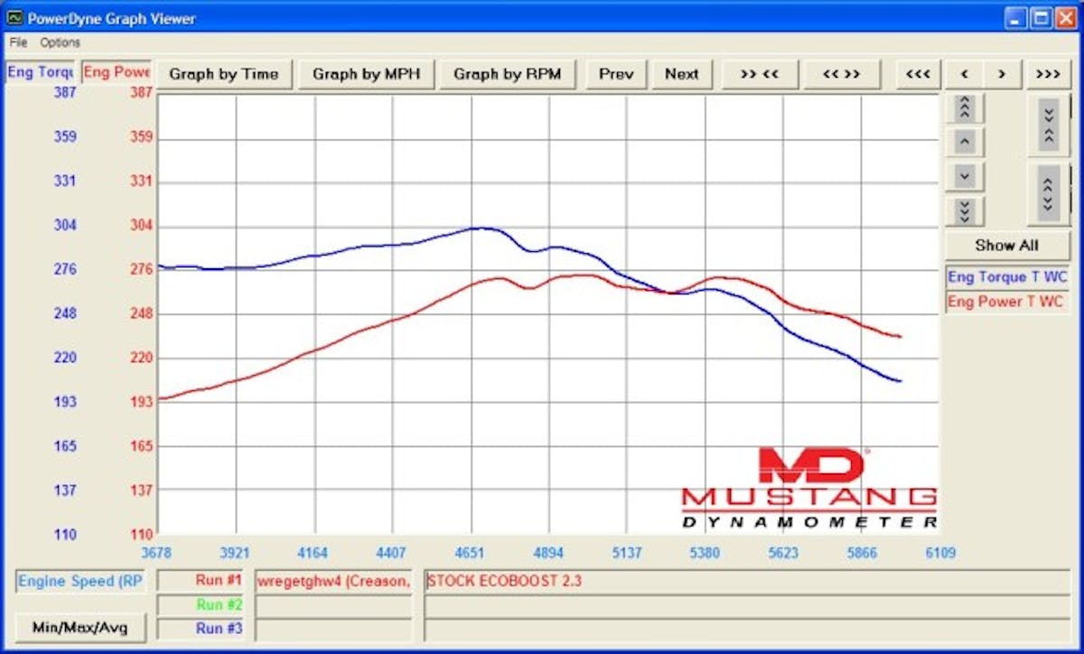 Final power numbers ended up at 306.7 hp and an impressive 370.3 lb-ft of torque at the rear wheels. That’s a gain of 33.5 hp and 66.5 lb-ft of torque to the rear tires. Assuming a 12-percent power loss through the drivetrain our EcoBoost was making 343.5 hp at the crank and 414.7 lb-ft of torque. That’s better than current Mustang GT levels of torque at the crank, and equal to or better than a 4.6 3-valve 05-10 V8 with a few bolt-ons in terms of power at the wheels..