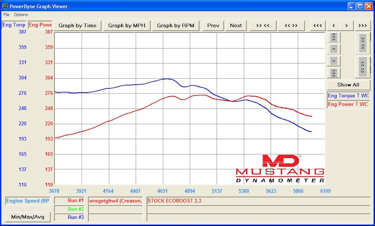 Prior to our installation, we baselined Project 5-Liter Eater at London Chassis Dyno in London, Kentucky. There, we, were able to spin the rollers to respectable 273.2 hp and 303.8 lb-ft of torque at the rear wheels with the car stock. These are respectable numbers and put us at around 12-percent parasitic loss between the crank and the wheels on horsepower. With torque the loss appears to be less than 12-percent, leading us to think that perhaps the EcoBoost engine torque is a little under rated from Ford.