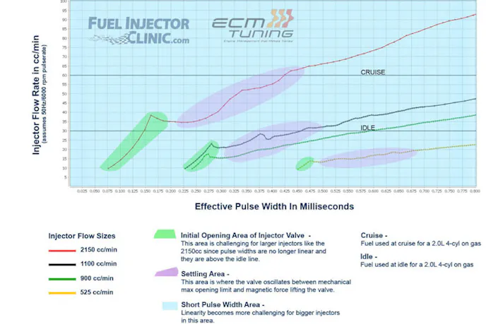 “Typically speaking, on most small or OE injectors, you are always running in the linear phase of injector operation, meaning that the injector valve opens fully during each pulse. That’s easy to tune,” Jens von Holten, owner of Fuel Injector Clinic, said. “With the big injectors that the ‘street beasts’ use these days, we are no longer opening the valve fully at idle and cruise. But this is what we do in the performance world, right? We move outside the original design parameters and make the parts work. Same with a big fuel injector; we are forced to see how we can make the engine run smoothly while the injector valve is only partially opening.”