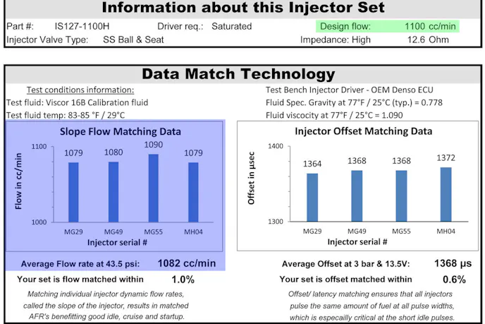 Of course you want each injector to flow the same amount. Dynamic matching is the first stage of the Data Match Technology process requires pulsing the injector at multiple points through the entire linear operating range and matches the injectors that flow within 1 percent of each other. Fuel Injector Clinic provides precise data on a sheet with each serialized injector set.