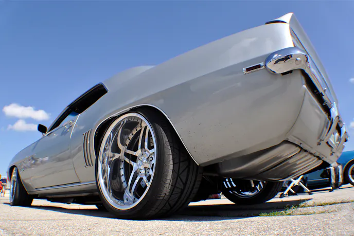 As you can see, wide tires are going all around for the Pro-Touring trend, and many cars have front wheels and tires that are wider than what others have on the rear. The Draft looks great on this Camaro, with a double five-spoke design.