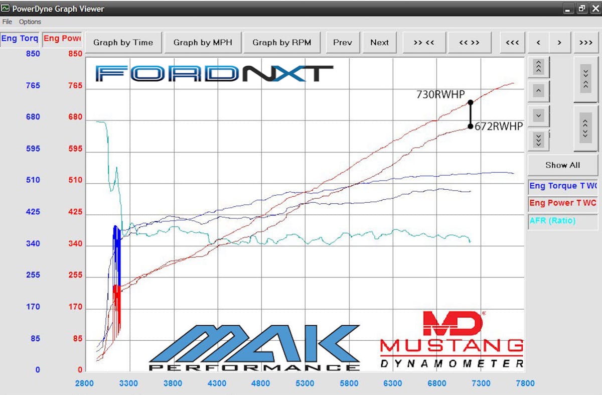 For such an easy intake swap, the results were quite impressive. The MAK team adapted the connections join the 2018 IMRCs to the 2015 harness. Then they duplicated the 2018 IMRC tables in the calibration using DiabloSport hardware and software. As a result of these changes the blown S550 picked up more than 60 horsepower and 50 lb-ft at the rear wheels.