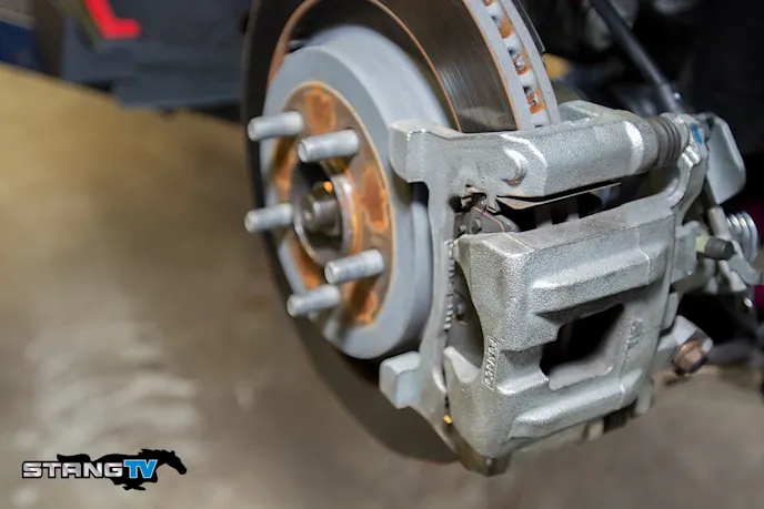 From left to right: with the front wheel off the hub, start by removing the brake caliper. Next, disconnect the ABS line by popping off the clip, and remove the top bolt holding the sway bar end-link attached.