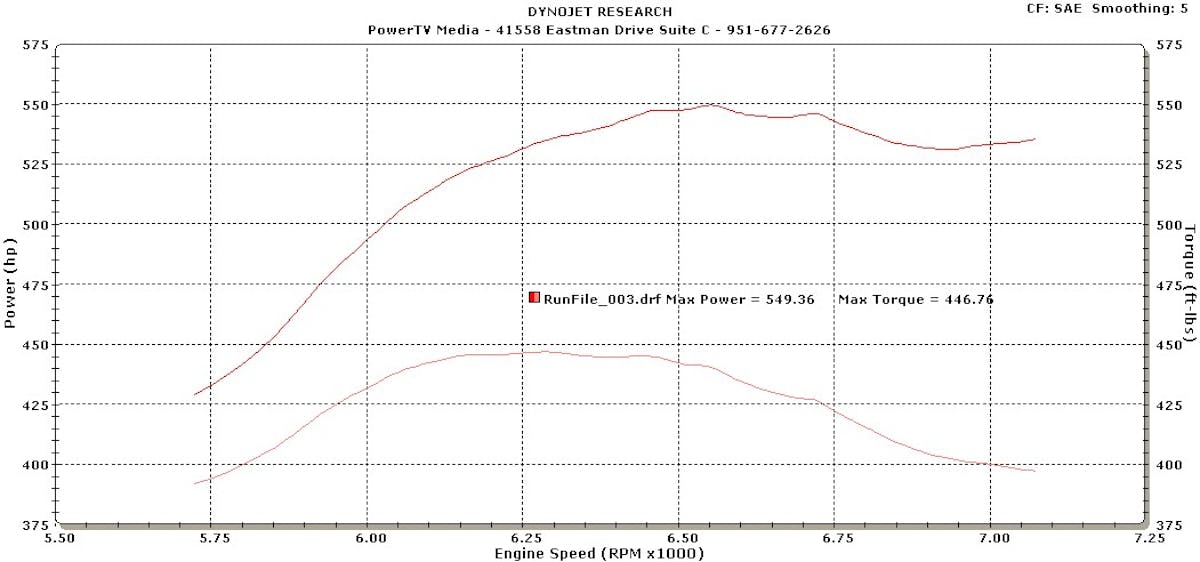When we first dynoed 666 we didn’t have any proper wheels for it. We had just upgraded our tire size from a 26×10 to a 28×10.5 and we had fender rubbing issues that we needed to deal with. Not wanting to what any longer to see what the new 427 was going to put out for power numbers, we found a spare set of our old dirt track car’s wheels and tires that fit perfectly onto the Mustang. While it might have all fit properly, traction wasn’t all that great and we could watch the tires smoke on the dyno at the end of the run while only producing about 515hp. With the rubbing fixed and the slicks in place for a few test pulls (it’s not a good idea to make a bunch of runs with slicks on a dyno) we managed to make 549 hp and 447 lb/ft of torque, which made us happy campers.