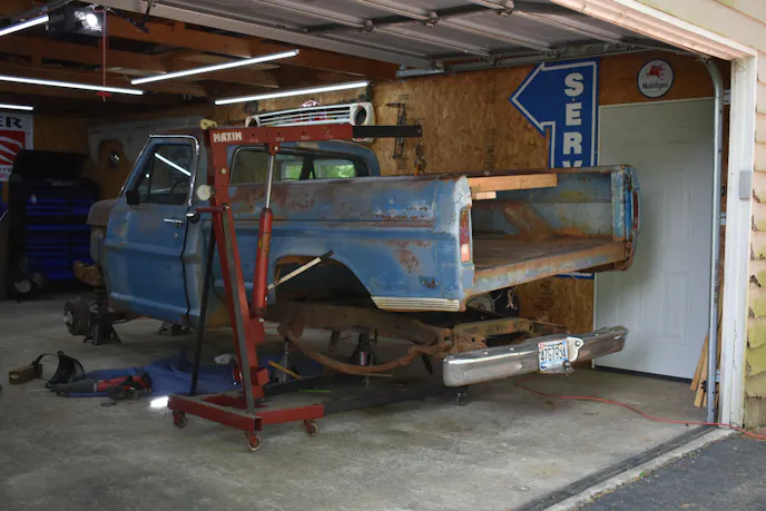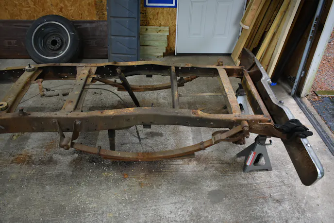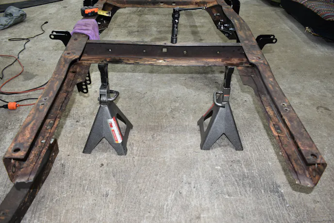 We set out to accomplish that task, starting with removing the truck bed and rear bumper/brackets to allow us to move the center frame crossmember rearward enough to fit the Mustang tank. Then we supported the rear frame with jack stands to make it sturdy.