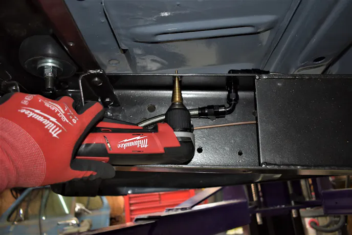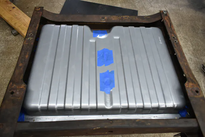 To remove the crossmember, we used a grinder, chisel, and punch to knock off the rivets holding it in place. Then moved the crossmember to the rearmost portion of the frame, and flipped it upside down so the “hump” is facing down towards the ground. Finally, align the rear bed bolt holes and enlarge them to make sure they will fit the bed bolts. These are on the top side of the frame. Now it’s time to mock the Holley Sniper tank into the location we have selected for it to go. After seeing that it’s very close to just slipping right in, we took some overall width measurements and removed about a half-inch of the bottom portion of the frame rail on each side. This is to allow the tank to fit flush against the rail and in the position we wanted. (If the tank doesn’t have the pump, fill, and sending unit installed, make sure to tape up the holes so nothing gets into your clean and new tank).