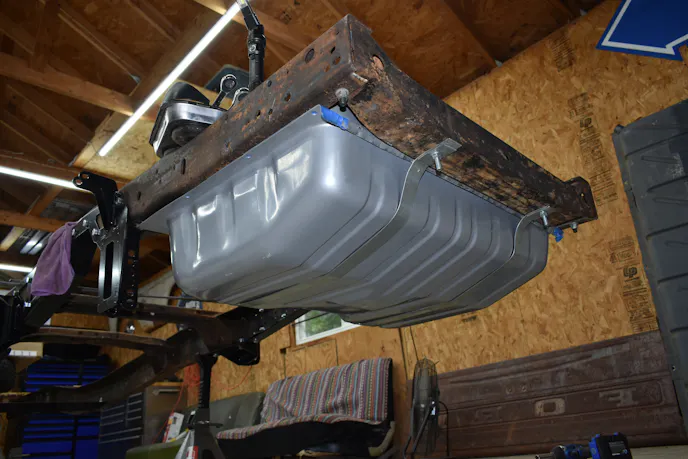 In case you weren’t aware, 1960s trucks had their fuel tank in the cab, behind the seat; Chevy and Ford both. This is obviously not the safest location to put it—you’re essentially driving a bomb with all the fuel directly behind you at all times. That’s why it’s common for owners of these trucks to relocate the tanks to the rear portion of the truck under the bed, where the factories eventually moved them.
