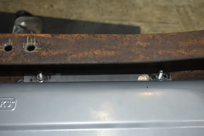 Since we have plans to autocross this truck, we went a little overboard in adding additional support. The gas tank has an additional lip past the weld where the two halves of the tank (top and bottom) are welded together. We drilled two holes through the lip of the tank and through the frame and used two smaller bolts to secure the sides of the tank to the frame directly. In order to make sure there was an easy way to keep the nuts from spinning, we used a piece of ½-inch wide steel and welded two nuts to use inside the frame from the top. (we didn’t want to tack-weld these bolts through the frame because it may be hard to get them all to line up later.