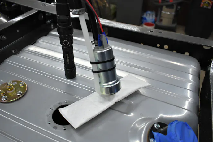 We designed and used all Earl’s Performance Plumbing for the entire fuel system. As you see in the photos, we used -6AN fittings, lines, regulator, filter, NPT sealant, wrenches, and more. We used -6 AN to 1/4″ NPT to adapt the AN line to the Holley Sniper Fuel Hat. Scroll up for a complete parts list including the 1969-1970 Mustang fuel tank system from Holley.It is important to mention that we switched out the OE fuel sock for the Holley HydraMat direct-replacement sock to make sure we keep the fuel supply to the 400 lph pump under hard cornering. The HydraMat is like a sponge for fuel—it sucks it up from wherever it touches the fuel and keeps the pump primed.