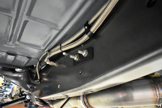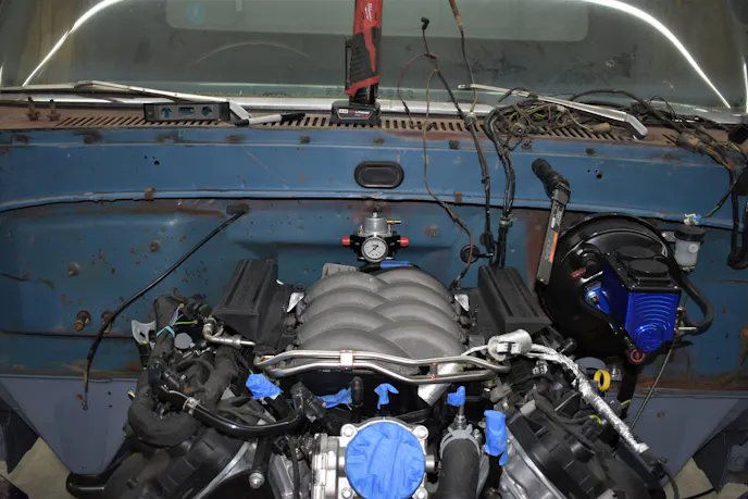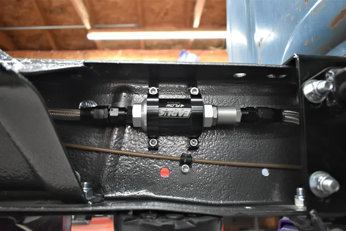 Then we had to decide where to place the regulator, wanting to position it somewhere that looks good but that was serviceable and would give us access to the gauge in case we needed to diagnose something with the truck. So, it was decided to mount the regulator on the firewall right behind the engine. We drilled the firewall and installed some threadserts to mount it. Next, we decided where to mount the fuel filter. We wanted to mount all the hard parts first that are in a fixed position and then run the lines, and found a nice spot between the suspension inside the frame rail that would be easy to service.The check valve goes on the outlet side of the filter, as seen here. It’s the silver-colored little part on the right side of the Earls filter.We wanted to keep all of the lines inside the frame rail to keep them out of harm’s way, so we ran them through the rear crossmember to the Earl’s fuel filter then secured them to the frame using Earl’s hose and tubing separators. These are excellent clamps that made mounting and securing the lines simple.Here is where we had to get creative—we were approaching the mid-pipe and long tube headers section of the truck and really wanted to keep the lines away from the hot headers. We ended up using Earl’s bulkhead fittings to go through the frame to transition the lines to the top and outside of the frame for the last few feet of the run. In this photo, you can see the bulkhead transition and then again, the use of the Earl’s Hose and Line separators. We used Earl’s Flame Guard Insulation to make sure that any heat around that section of the line wouldn’t be an issue and would keep the fuel nice and cool. We have used this product in the past with our brake and clutch lines with great success.From here it was just a matter of measuring and assembling the remaining lines to make all the connections for the return line. To make the final connection to the OE fuel rail we used the Earls O.E. Fuel line EFZI Quick disconnect fitting that converts the OE ⅜ fitting on the fuel rail to 6AN.
