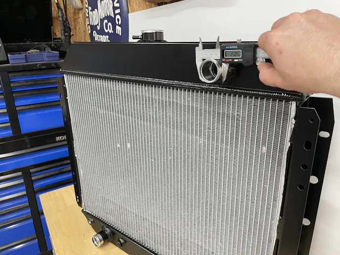 Figuring out how to physically bolt in the radiator was easy—Champion Cooling Systems and others have that down pat—but like we said, the hoses are a complication. The stock F100 radiator has a 1 3/4-inch hose for the inlet and a 2-inch for the outlet, so step one was to get Champion to change the inlet and outlet on the new radiator, which they gladly did. This was much easier than fabricating “adapters” from aluminum tubing and multiple hoses. The goal was to keep this as simple as possible, and after talking to Matt it is now.