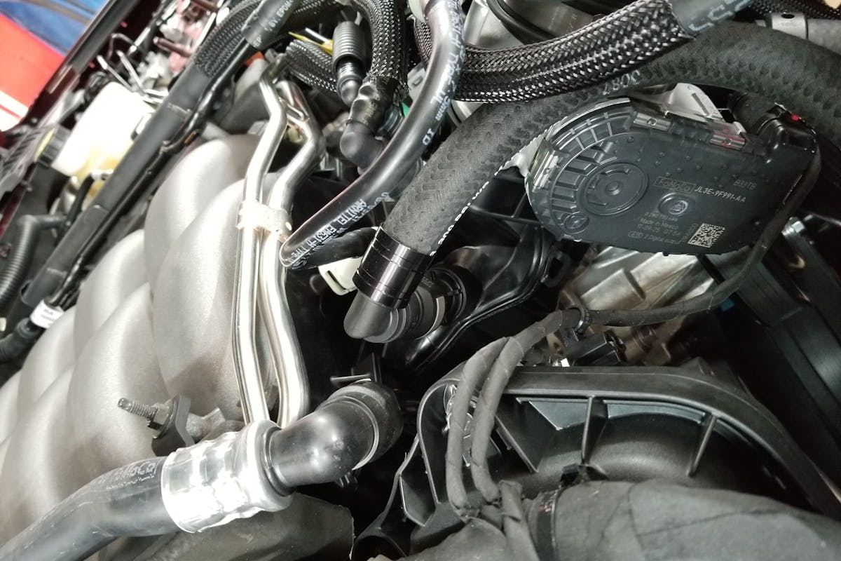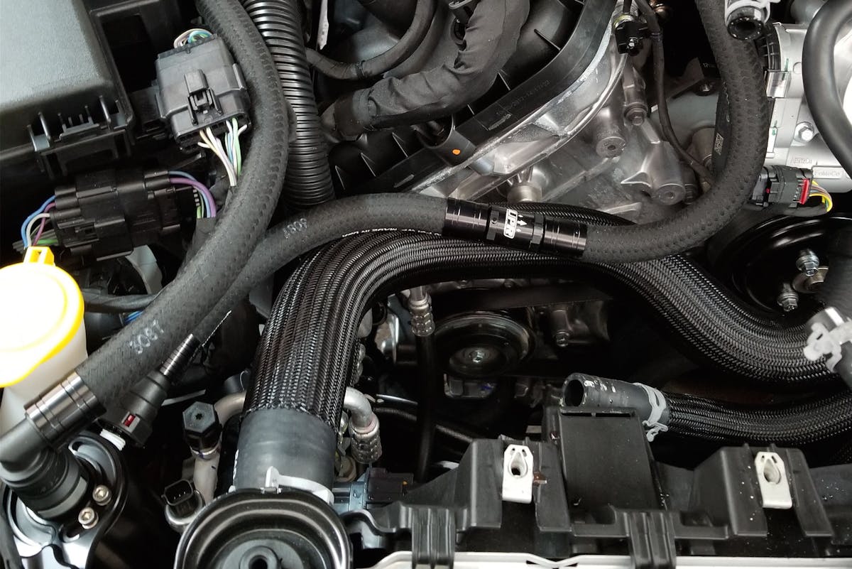 “For the 2018 Mustang the install is as simple as can be,” Adrian said. “Start by mounting your can by the radiator support with the provided bracket, followed by a few quick click factory connections off, and a few more clicks of the pre-assembled braided hose on. From start to finish this one can be installed in less than 30 minutes.”
