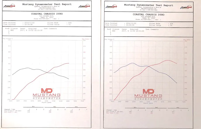 By adding the JLT intake and a companion tune from Sam, the new Mustang picked up peak-to-peak gains of 15 horsepower and 24 lb-ft of torque at the rear wheels on Coastal’s in-ground Mustang Dynamometer.