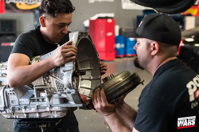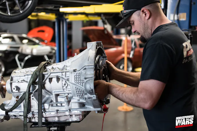 Of course, the transmission had previously been removed and sent out to LaSala for a refresh, so our Mustang sat on the two-post lift in the meantime. Once it made it back into our hands, it was time to put it back where it belonged, along with the new torque converter. This part was pretty easy, but it helped to have a couple of sets of hands (and that aforementioned lift).