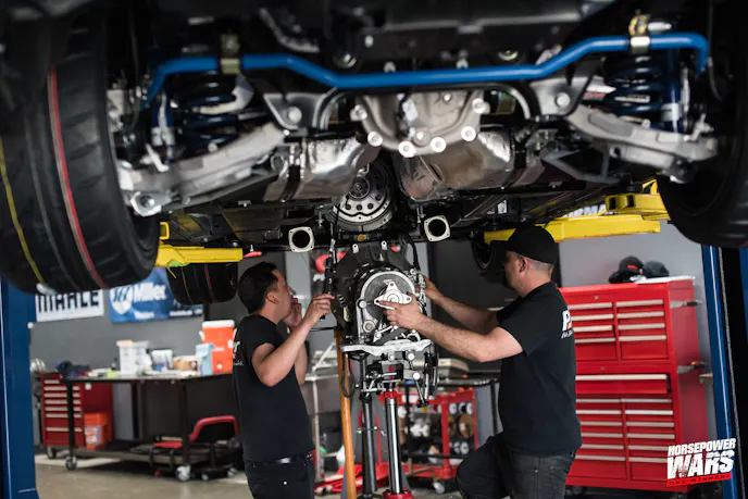 The transmission installation was completed before the recommended 13 quarts of ATF were added gradually. The team also installed 3.31 gears into the Mustang’s Torsen differential, replacing the stock 3.73 gears, for better utilization of each gear throughout the quarter-mile. Finally, taller Mickey Thompson ET Street R tires (305/45R17) were chosen in an effort to soften the hit in conjunction with the lower gear, helping to keep the tire planted upon launch.