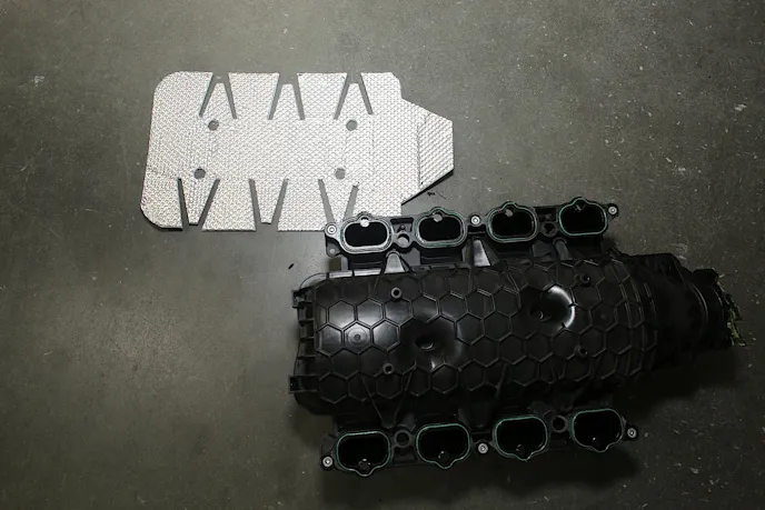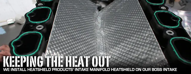 For the BOSS intake, the heatshield, part number 140007, fits behind the intake runners, blocking radiant heat from the engine valley and reducing the amount that is absorbed into the runners. Use of the intake heat shield should result in a more dense incoming air charge for our turbocharged engine by keeping radiant heat away from the intake runners.