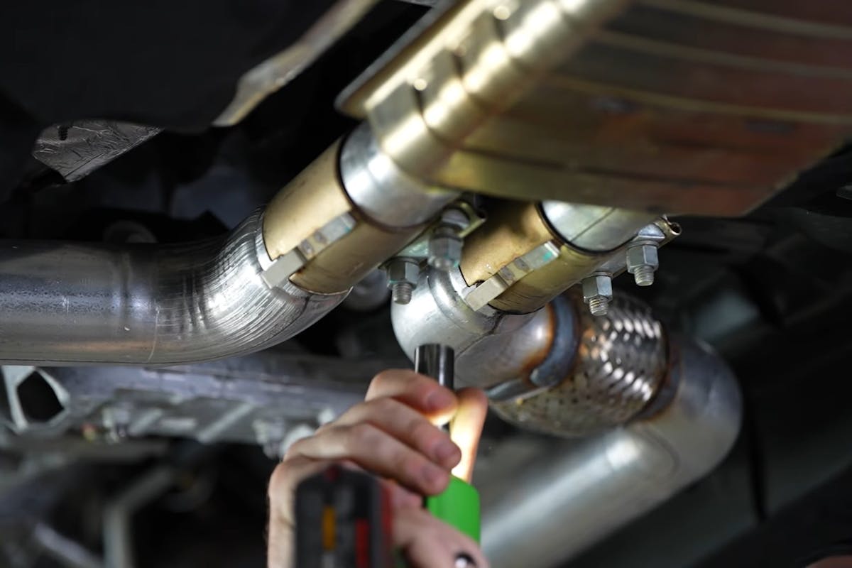 After removing the stock resonator assembly, the new SPE X-pipe section, crafted from 304 stainless steel, bolts in using factory front clamps and SPE-supplied rear wrap clamps. Throughout the installation, SPE emphasized proper alignment, especially for the exhaust tips.