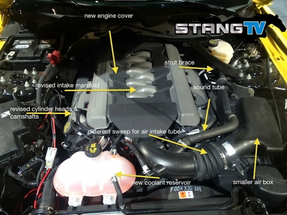 Today, through an unnamed source, we were able to secure two photos from under the hood of a 2015 Mustang GT. Although this car is a test prototype, in Triple Yellow, and likely the same one that we saw this week at the Detroit Auto Show, it’s wearing pretty close to production garb in terms of the engine covers. This prevents us from discerning much on the mechanical side, but there are a few things worth noting.