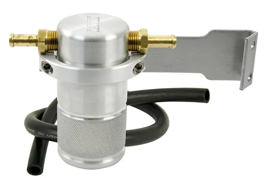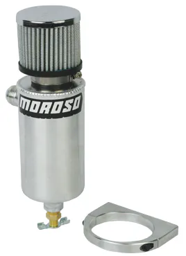 Moroso Air/Oil Separator for street use. These separators capture vapor and oil that has escaped into the PCV system. They trap the liquid and send the gasses back to the engine keeping the car’s emission system intact while improving engine performance.