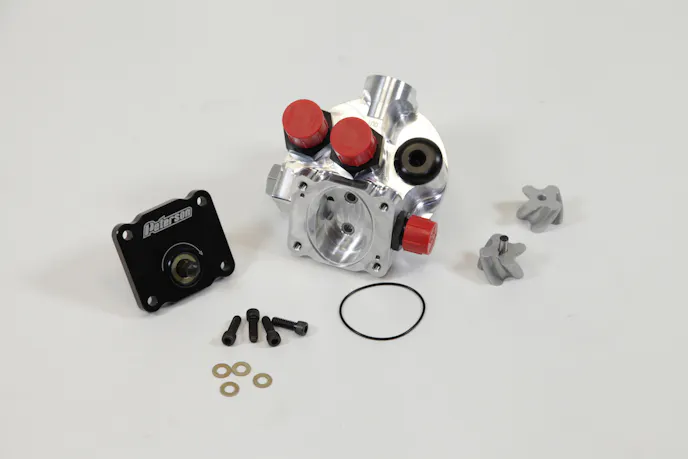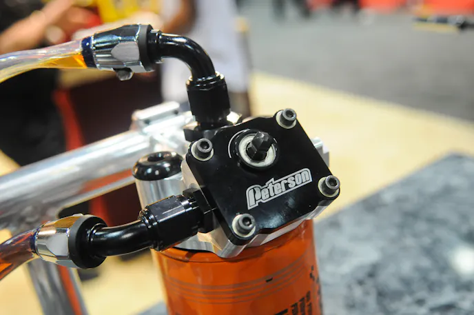 After some initial fine-tuning by their engineering department, virtually any viscosity grade of oil can be run through the Peterson primer, meaning compatibility is almost an assurance. “We began testing it with two-weight oil and went up from there, so it will work with virtually anything. The only thing we haven’t tried it with yet is water,” Morten told us.Featuring billet aluminum construction, the Remote Filter Mount and Primer features Peterson’s own patented R4 roots rotor design, which is found in many of their popular oil pumps, and is manufactured in a variety of configurations, including small or large (Fram HP6 and similar filters, often used in racing applications) filter sizes and inlet and outlet locations situated left-to-right or right-to-left on the small model.