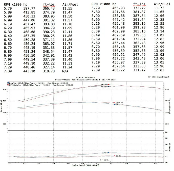 In the followup dyno test, the engine made more slightly more power and torque through the 6,000 to 7,000 rpm peak power range. With a little more time and learning on the computer’s part, or some additional custom tuning on the user’s part, the power band could be expanded. Note the richer air/fuel ratio for the second test. Again, the computer is still on a conservative pace until it gain more experience with the adjustments.
