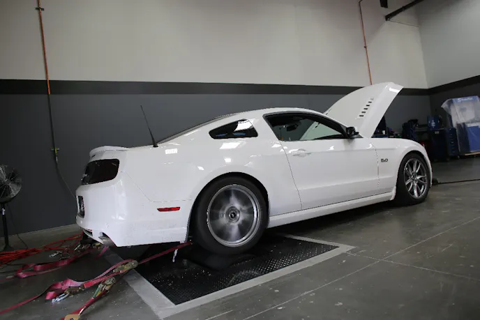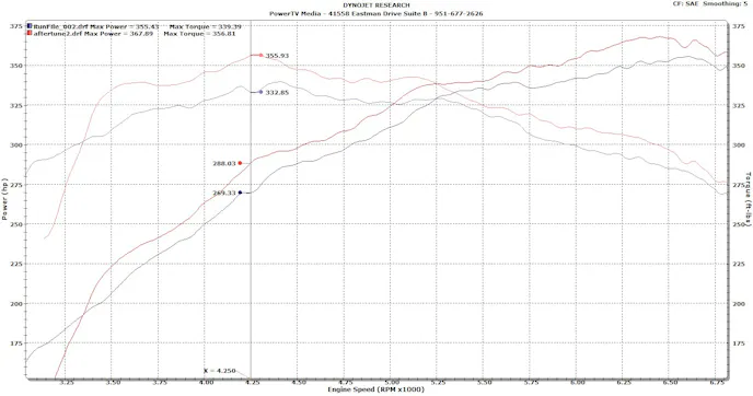 On the dyno our stock Mustang GT made 355.4 hp and 339.3 ft-lbs of torque. With the SCR 91 octane tune loaded, we made 367.8 hp, and 356.8 ft-lbs, a peak gain of 12.4 hp and 17.5 ft-lbs. Not bad for an out of the box flash tune.